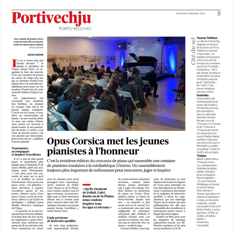 Corse Matin 3/12/2023 par Sacha Santini : Opus Corsica met les jeunes pianistes à l’honneur