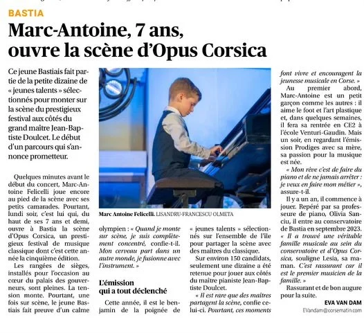Corse Matin 17 JUILLET 2024 par Eva Van Dam : Marc-Antoine, 7ans, ouvre la scène d’Opus Corsica