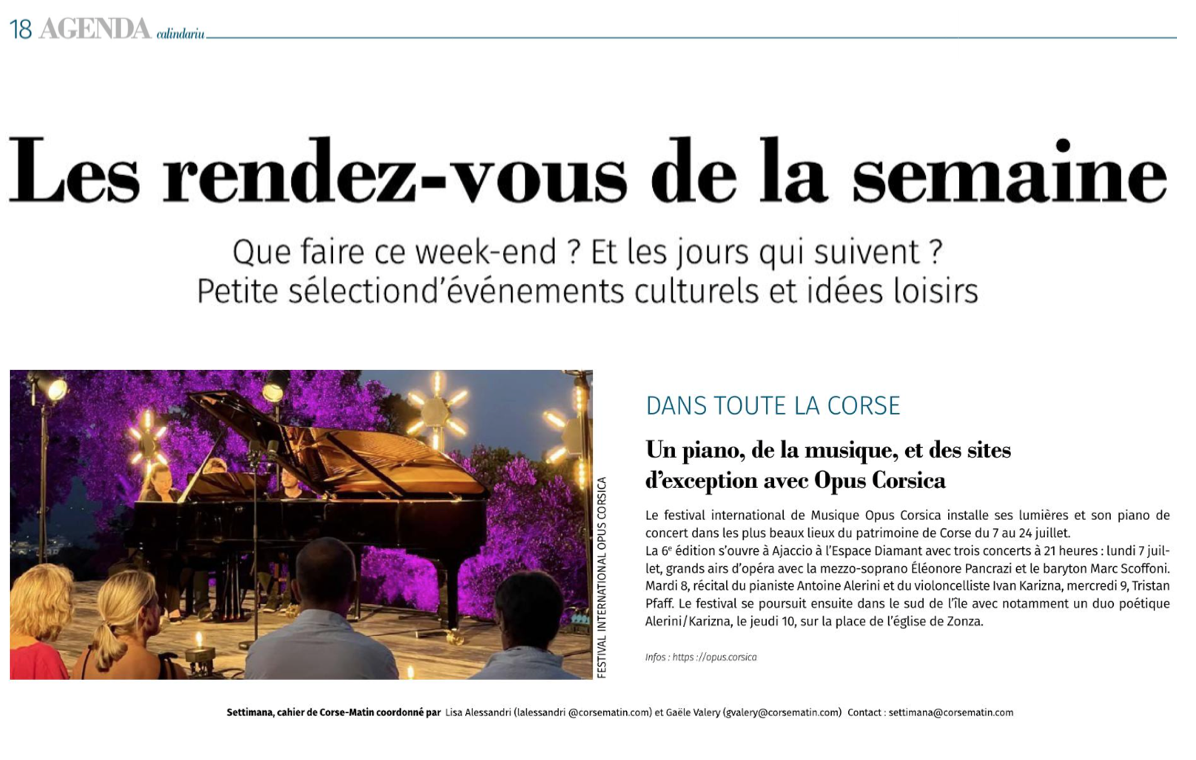 Corse Matin 4 Juillet 2025 par Lisa Alessandri : Un piano, de la musique, et des sites d’exception avec Opus Corsica PresseTélévision 1 juil. Écrit par Opus Corsica Les rendez-vous de la semaine Lisa AlessandriPHOTO FANNY HAMARD Opus Corsica https://opus.corsica