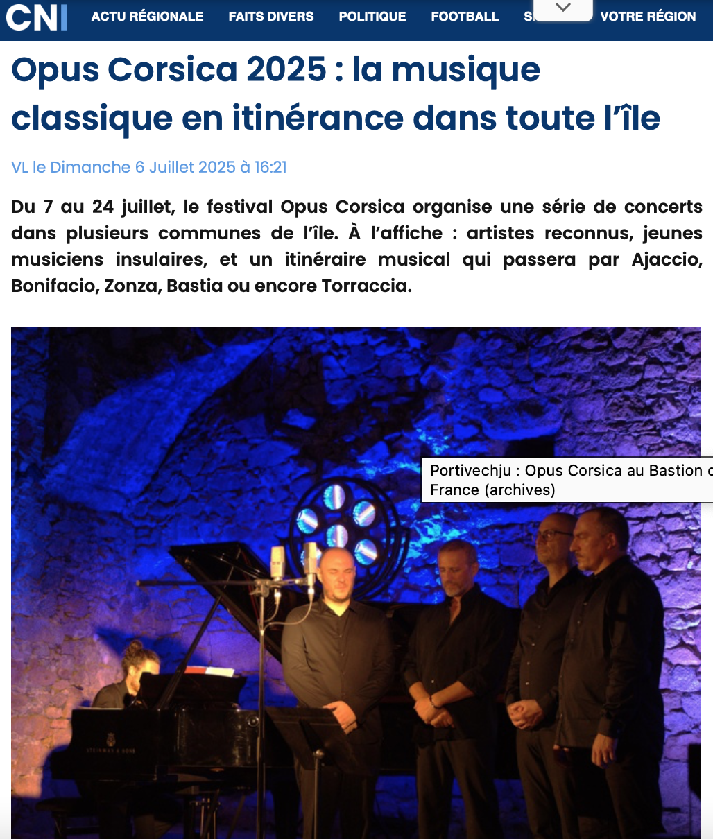 Du 7 au 24 juillet, le festival Opus Corsica organise une série de concerts dans plusieurs communes de l’île. À l’affiche : artistes reconnus, jeunes musiciens insulaires, et un itinéraire musical qui passera par Ajaccio, Bonifacio, Zonza, Bastia ou encore Torraccia.